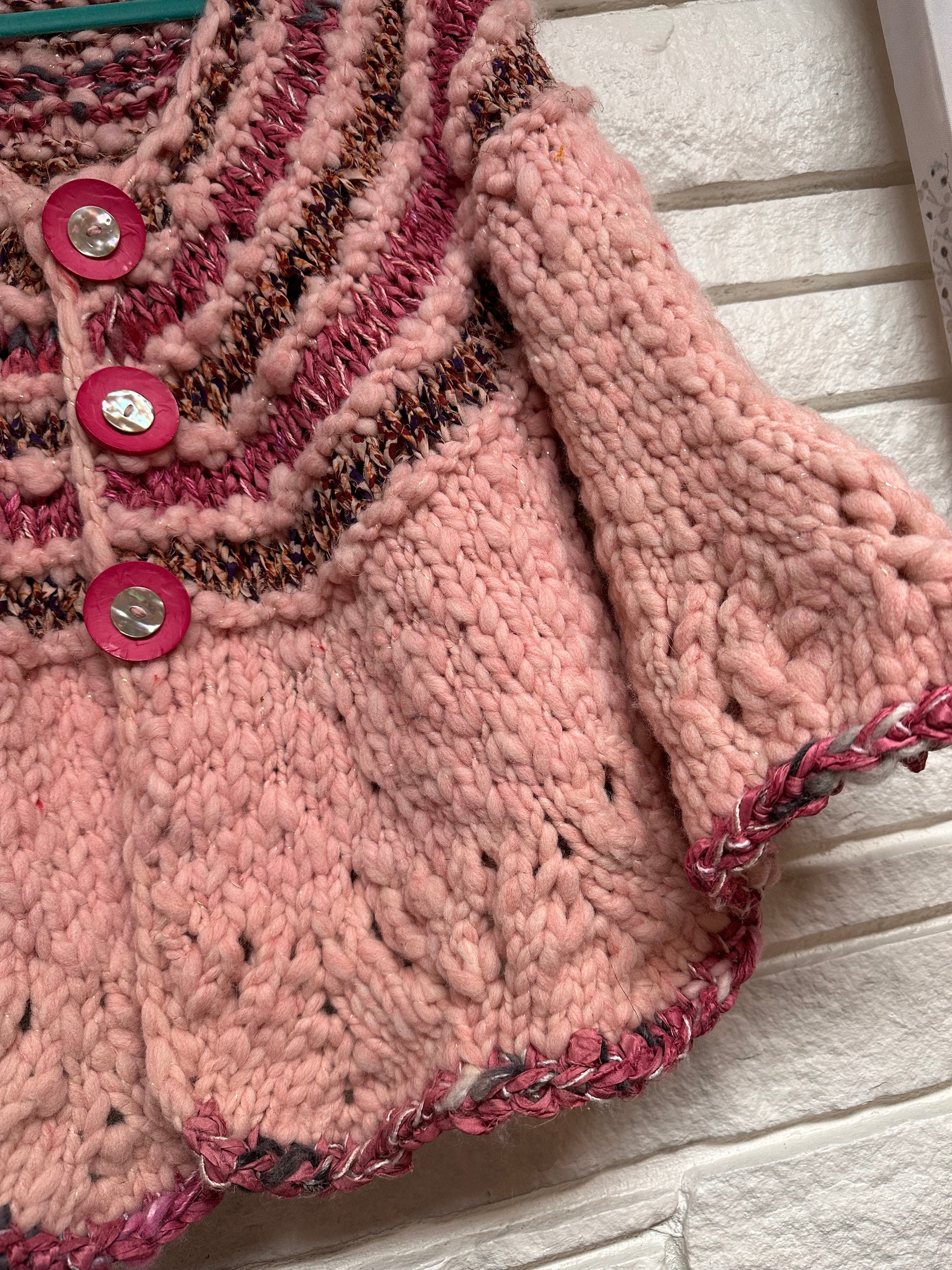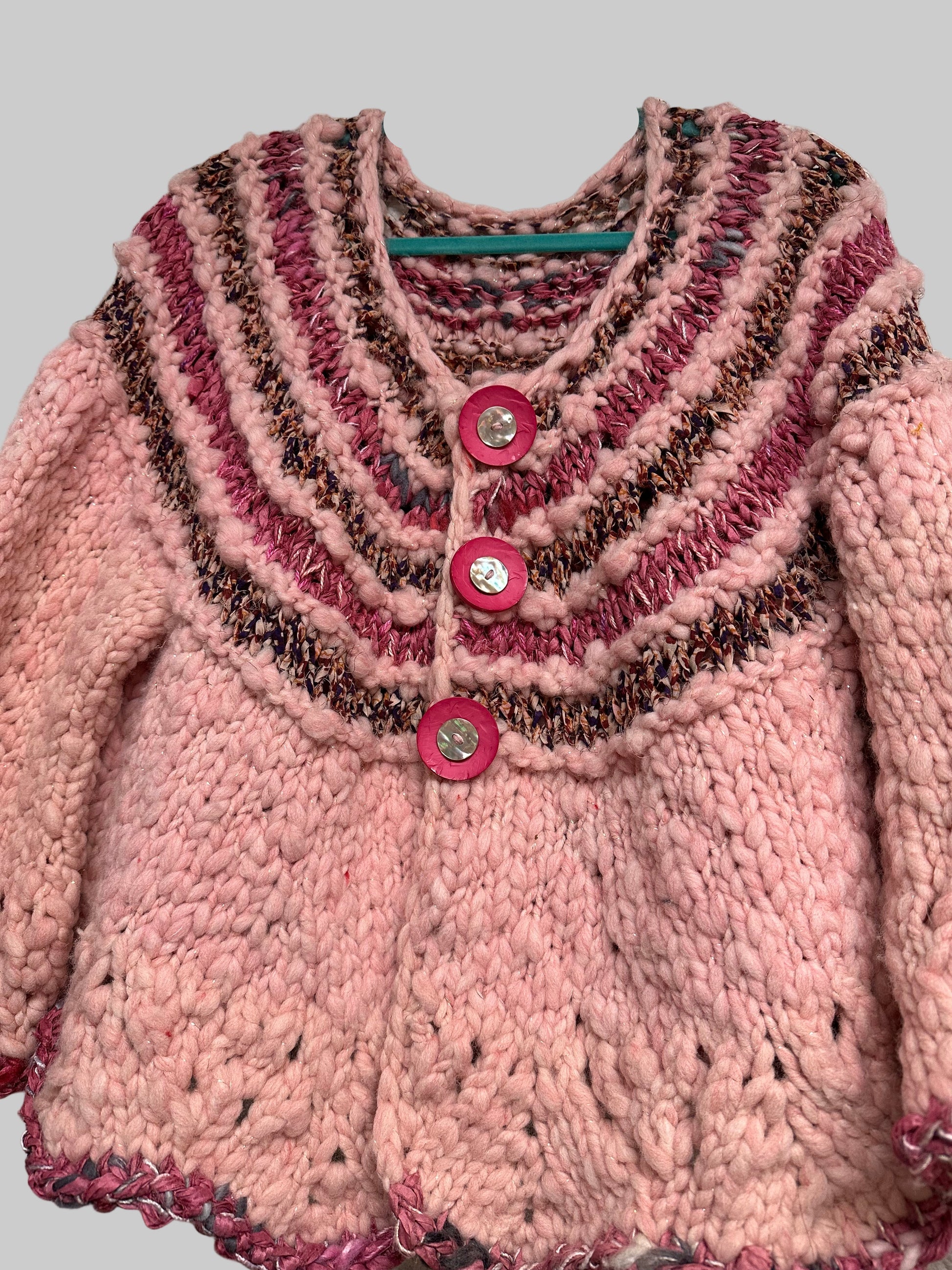 Wool and sari silk ribbon cardigan, snap buttons and bell sleeves. Knit lace trim. Size Med